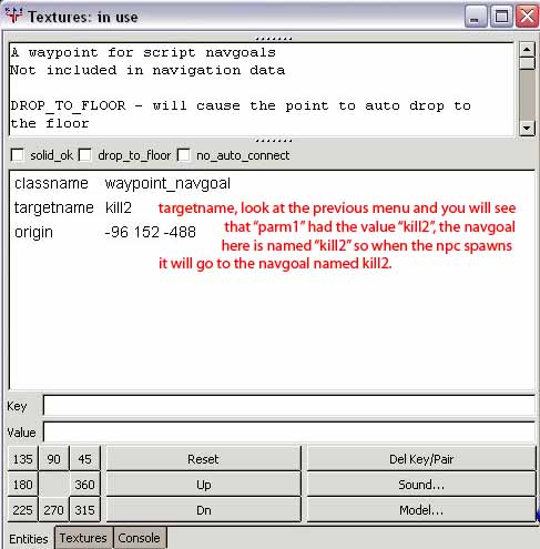 Dont panic, its not too dificult to understand, but all we need to know is it works, look at the text for a minute and see the "SET NAVGOAL" part, on the next line it says "SET PARM1", this is what we need to "tell" the NPC where to go in the level.